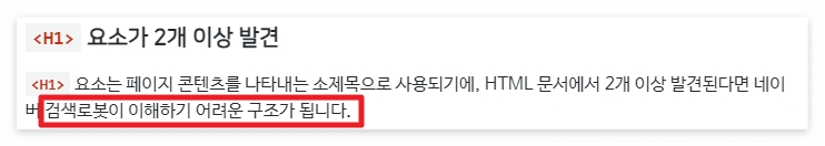 <h1> 요소가 2개 이상 발견이라는 문구를 클릭하시면 새창이 뜨면서 SEO 기본 가이드가 보이실 겁니다.